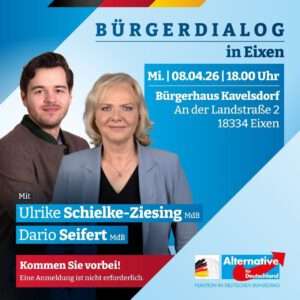 Am Mittwoch den 08.04.2026 bin ich zusammen mit dem Bundestagskollegen Dario Seifert in Eixen, wo wir gemeinsam den Bürgerdialog der AfD-Bundestagsfraktion veranstalten (Bürgerhaus Kavelsdorf, An der Landstraße 2, 18334 Eixen). Start ist um 18:00 Uhr.