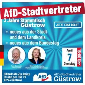 Am Dienstag den 07.04.2026 bin ich im Billardcafe “Zur Daisy” (Straße der DSF 27, 18273 Güstrow) anzutreffen. Zusammen mit dem Kreistagskollegen Peter Spanowski berichten wir neues aus dem Landkreis und aus dem Bundestag. Start ist um 18:00 Uhr.